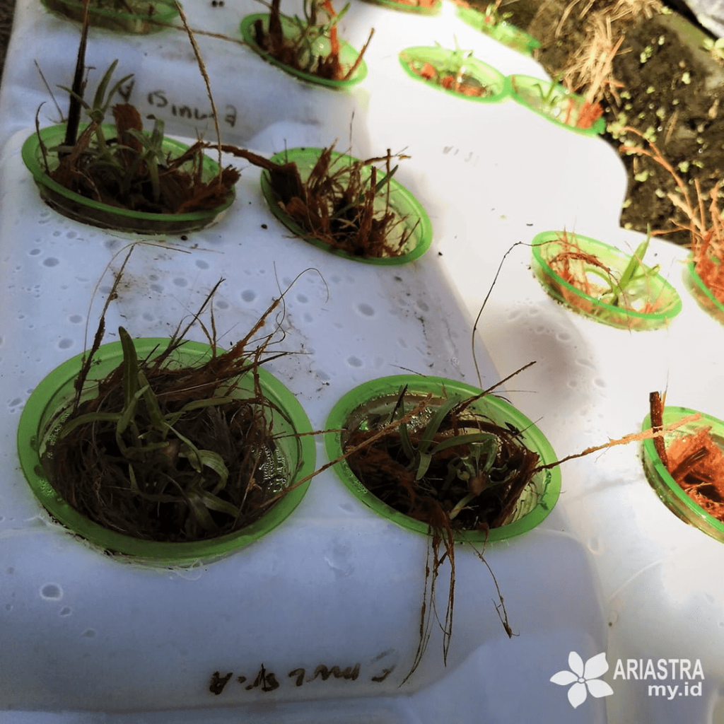 • Seleksi biji yang sudah sprout (kualitas baik) dan pindahkan ke media serabut kelapa sekitar 4-5 biji/gelas platik. Usahakan tunas akar diletakkan menghadap ke bawah.