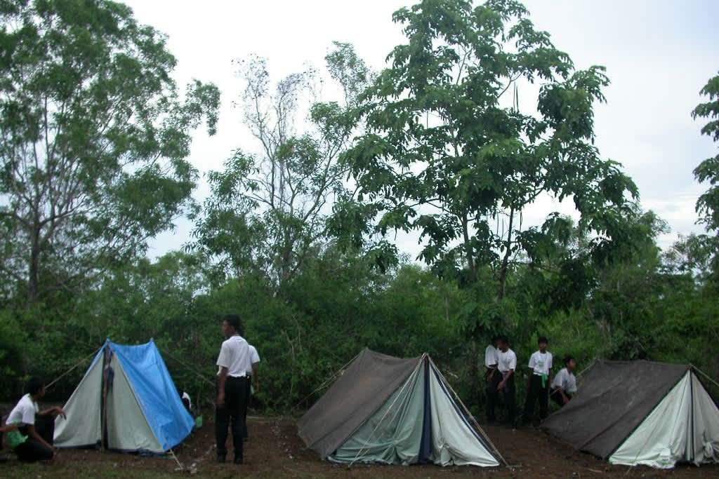 Area camp peserta berada tak jauh dari area camp panitia. Area camp berupa tegalan yang dibatasi oleh pagar tanaman. Lokasi tenda kelompokku berada di area paling selatan. Apabila hujan, tidak akan ada genangan karena akan segera mengalir ke tempat yang lebih rendah. Tenda yang kami dirikan adalah tenda terpal, didirikan dengan 2 tongkat pramuka dan beralaskan matras. Cukup sederhana dan hanya digunakan untuk beristirahat siang (masak dan makan siang) dan malam hari.